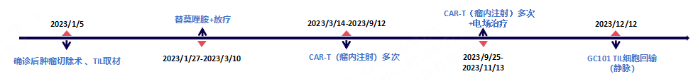 病危之际,W 先生先接受风险极高的脑部肿瘤切除术,术后进行替莫唑胺化疗与放疗治疗,但病情未得到控制,随后分别尝试 2 款不同靶点的 CAR-T 疗法,累计完成10余次瘤内注射给药,仍未持续阻止肿瘤恶化。